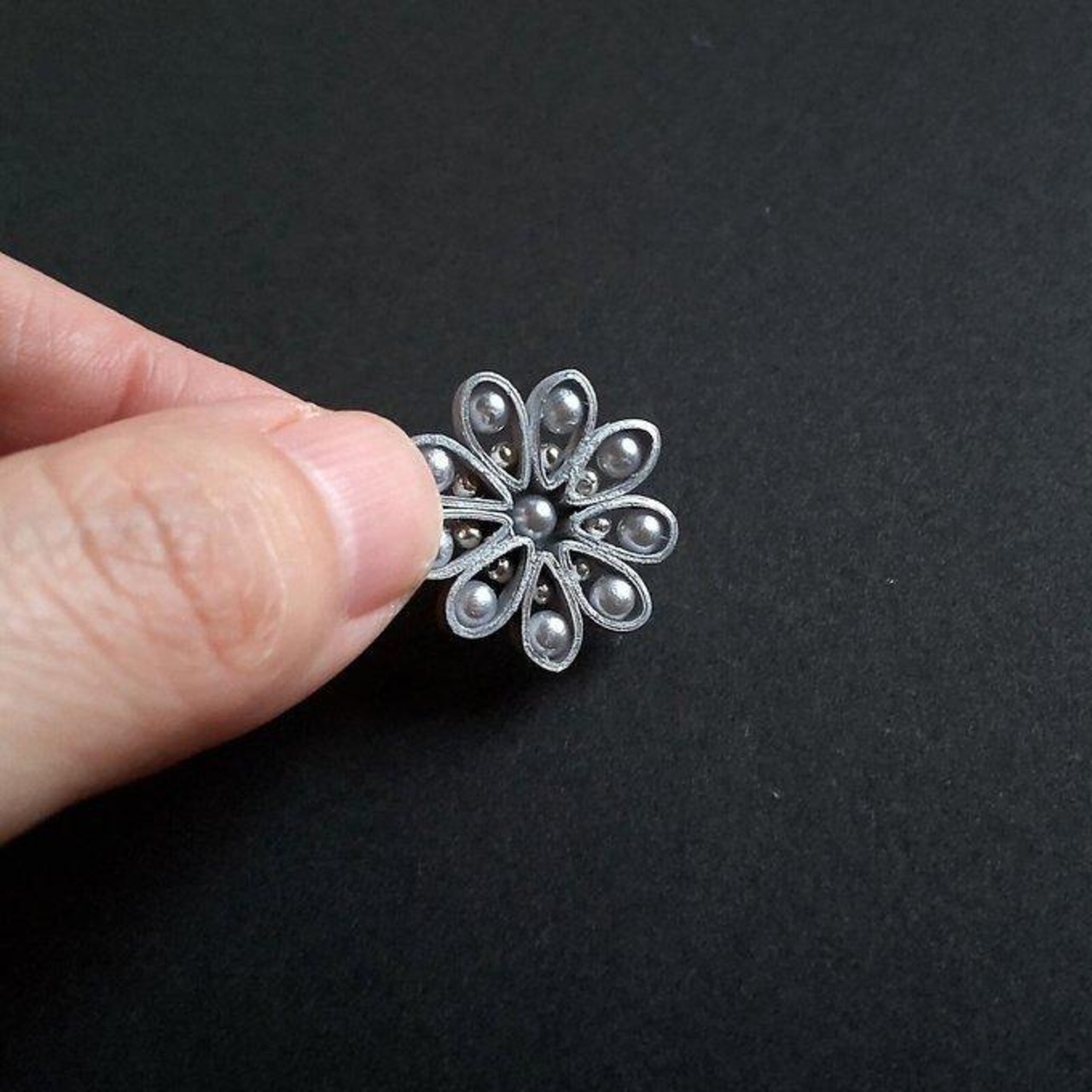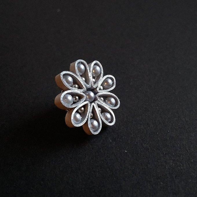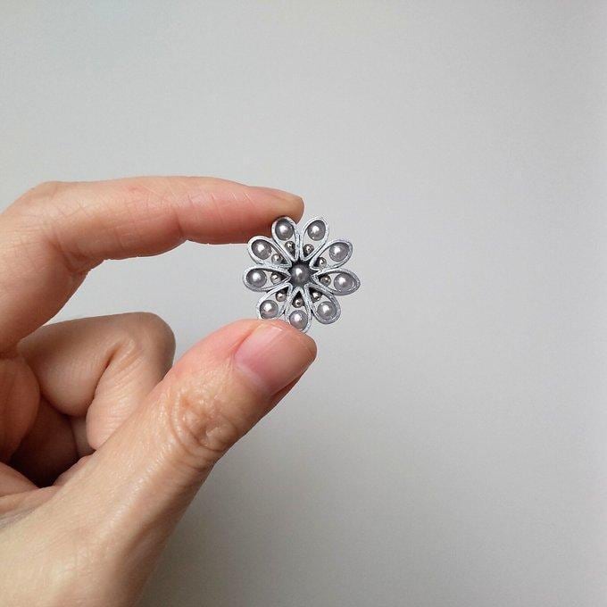 ライトグレーのパールビーズがつやつや光る、紙製ブローチです。