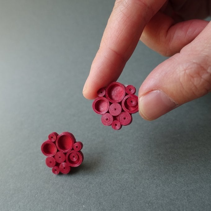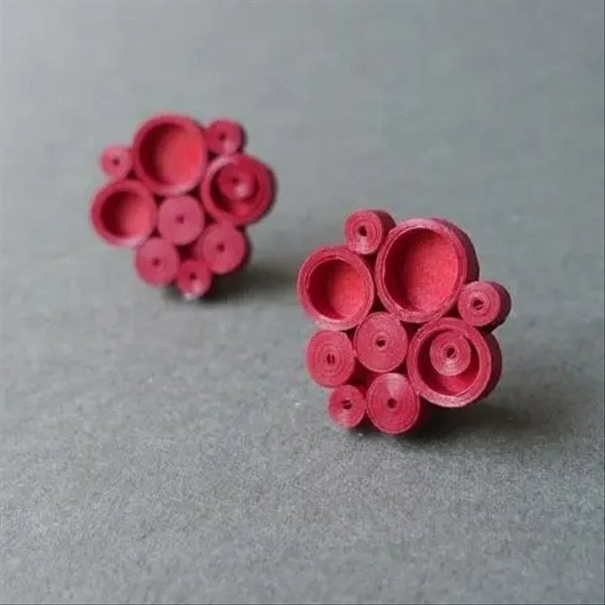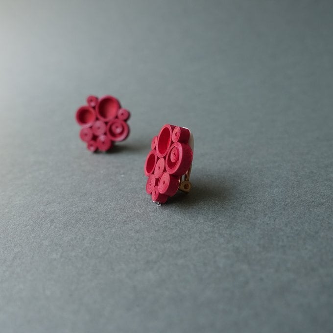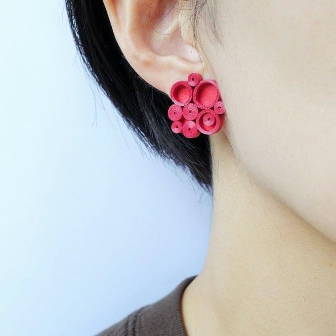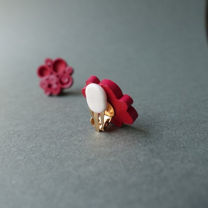 深い赤色の軽い紙製イヤリング(ピアス)です。