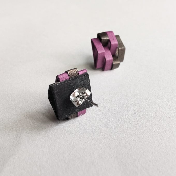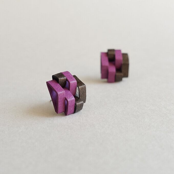 鮮やかなパープルと、ブラウンを組合せた、紙製のイヤリング(ピアス)。