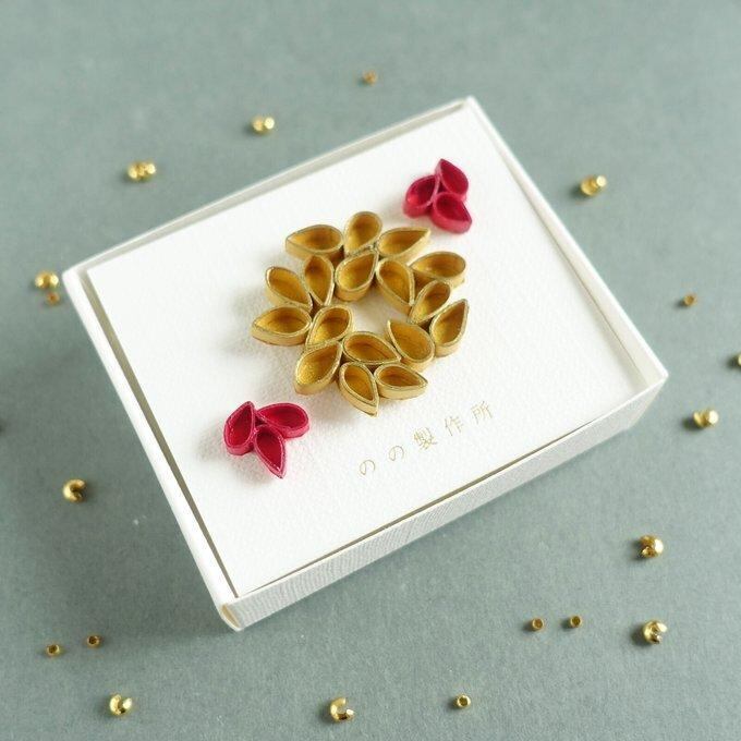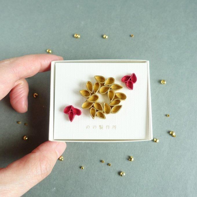まるでリースのような形の紙製ブローチと、小ぶりなピアス(イヤリング)のセットです。