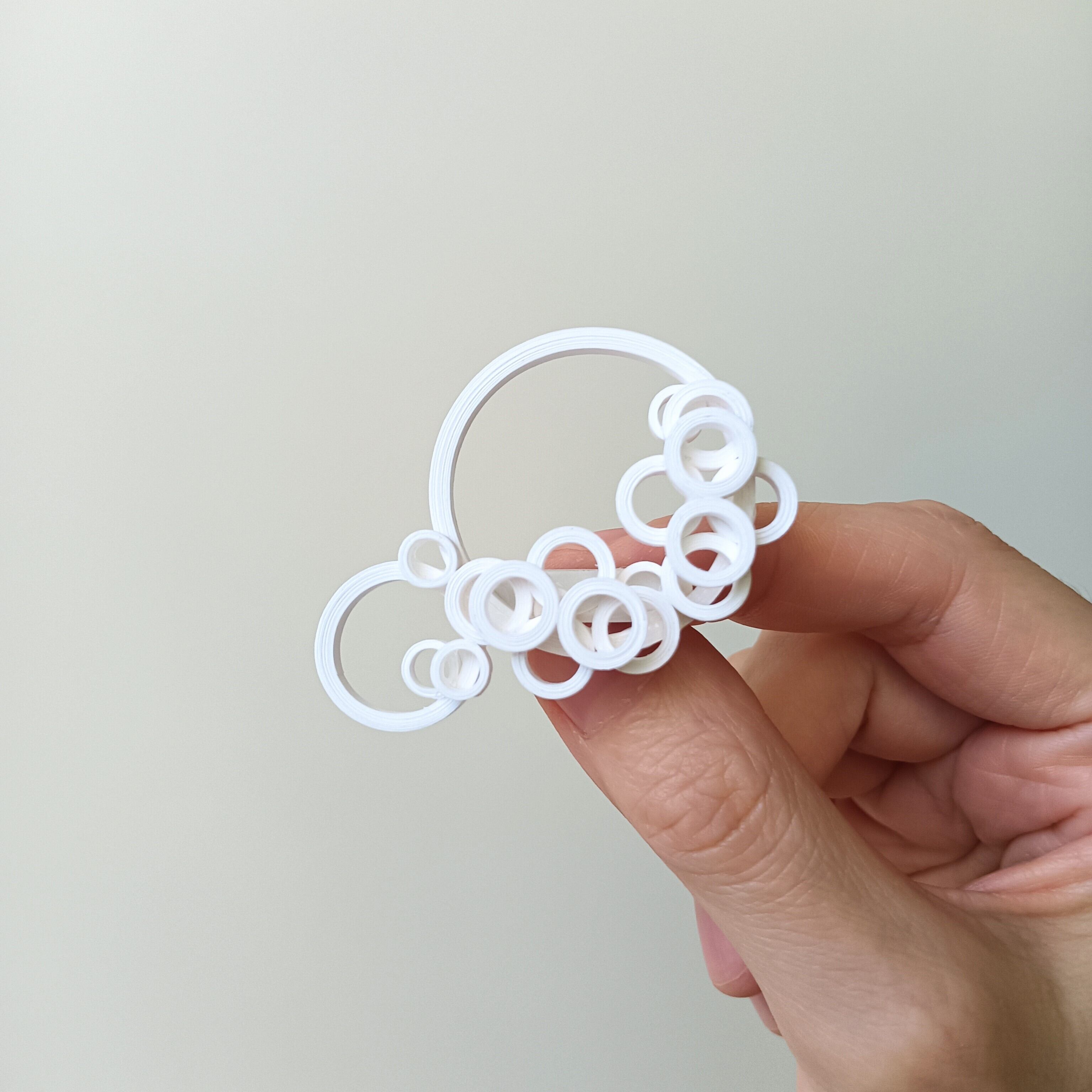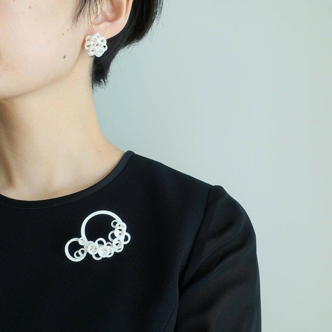 一つ一つ手作業で作った白い円をいくつも並べたモチーフは、泡のようにも花束のようにも見えます。