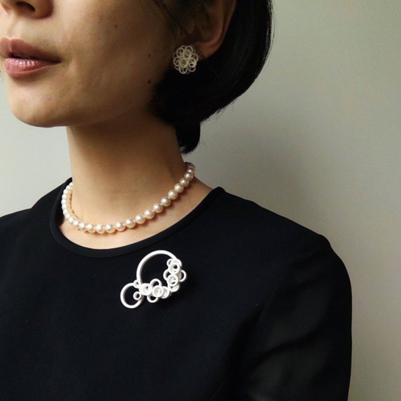 白いアクセサリーは、お洋服を選ばず合わせられ、付けると顔周りが明るくなるので、一つあるととても重宝します。
